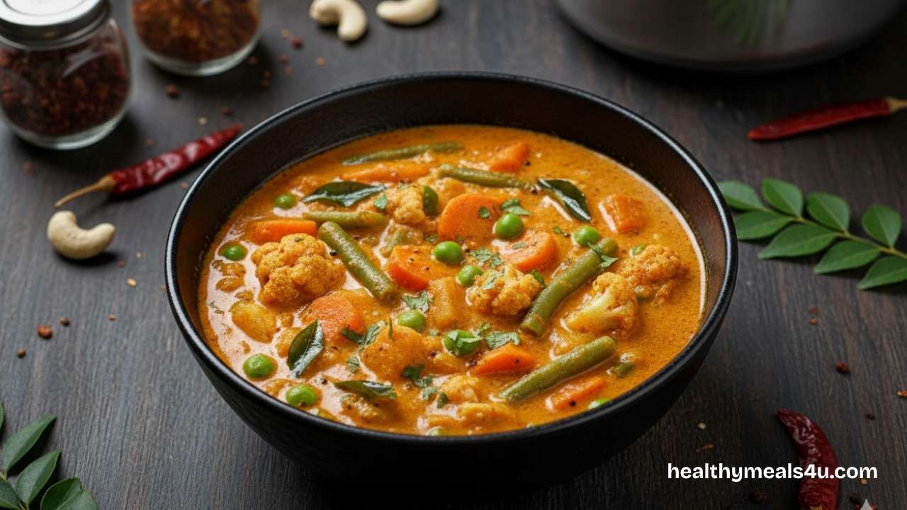 A mildly spiced South Indian vegetable curry that pairs well with roti or millet rotis. Low in carbs, high in vegetables, and rich in fibre — perfect for a balanced diabetic meal.